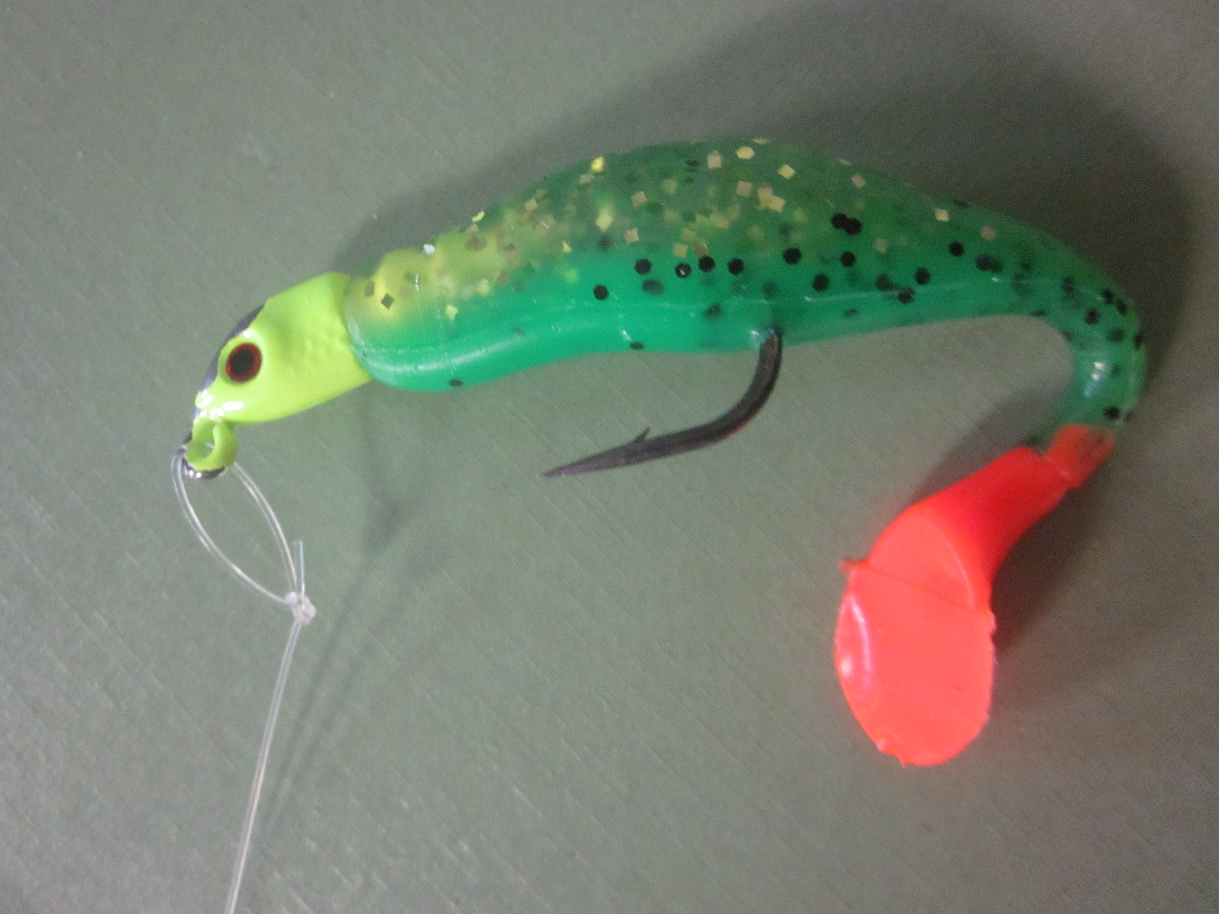 I tie a 1/8 oz. chartreuse flash jig head with a swimming “sea shad” paddle tail. There is no best color but I like the green speckled with an orange tail. Make sure you use a loop knot at the jig head for natural action.