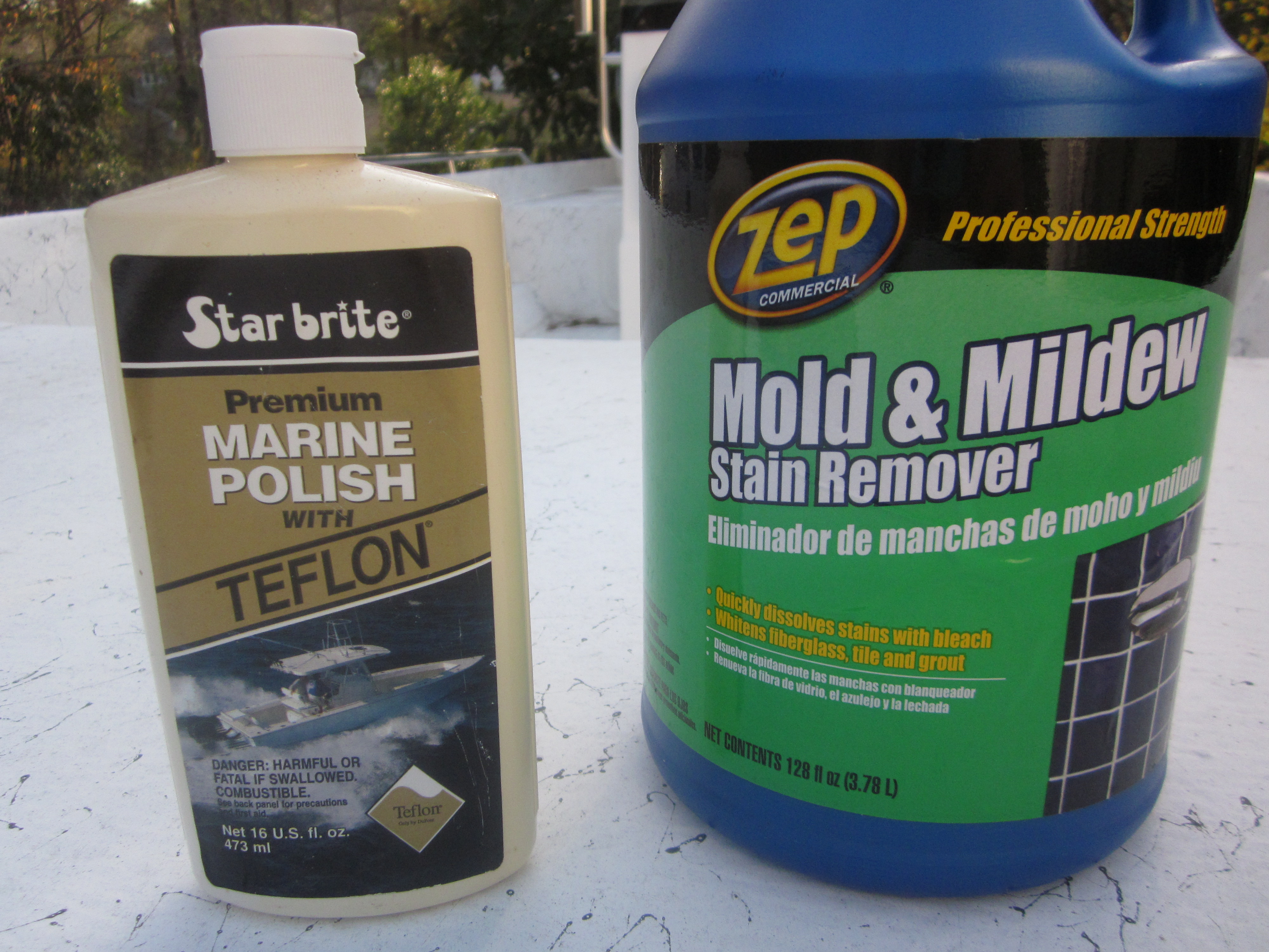 Next, I spray all stained surfaces with a stain remover. The areas I focus on is where dirt, grease and scum from the winter and maybe last year’s final trip hide. I always use ZEP Mold and Mildew Stain Remover. Less than $10 per gallon from Home Depot. This is alot less than West Marine Hull cleaner but very effective.