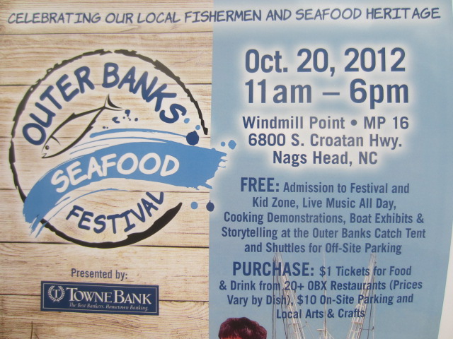On Saturday, 20 October 2012, the Outer Banks will be holding it first annual Seafood Festival. The festival will be held at the old Windmill Point property in south Nags Head on the bypass. The festival will run from 1100 through 1800.