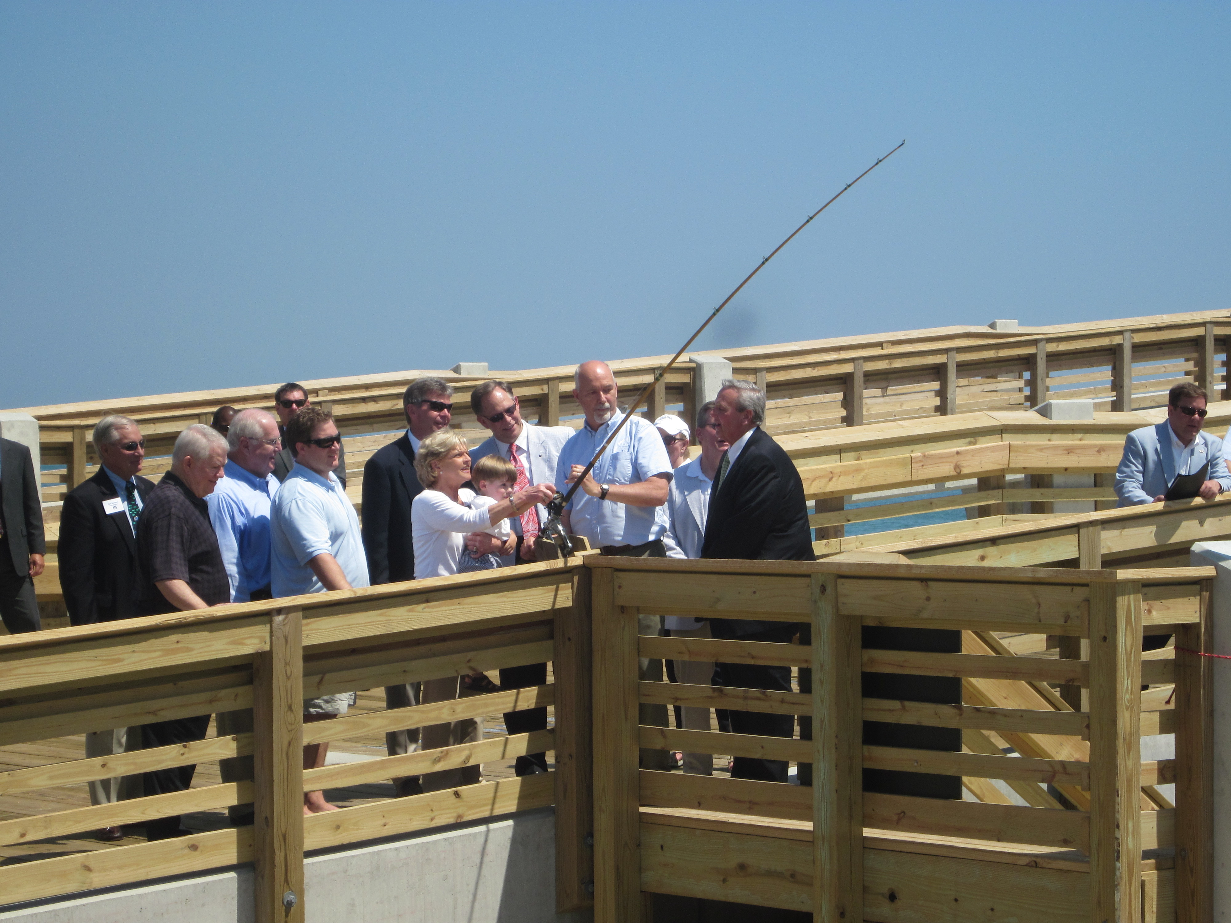 Next the many dignitaries made congratulatory comments. Then Govenour Perdue broke the champanye bottle a piling. As should be expected, the bottle was connected to a fishing rod. She just reeled the bottle into the pier.