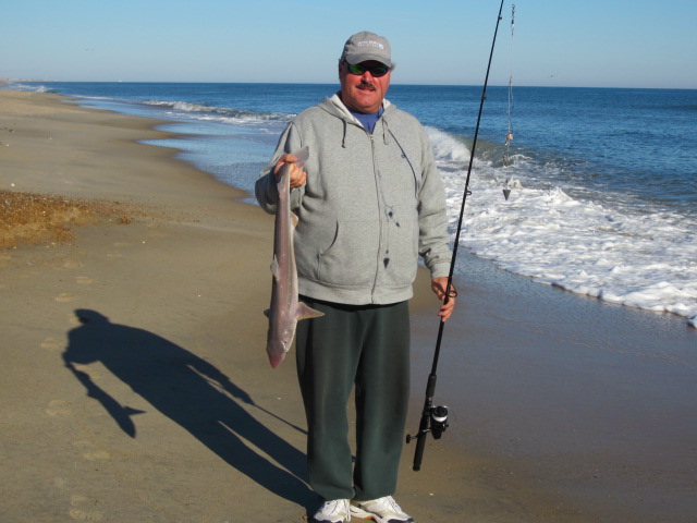 I took my eight foot surf rod with a standard two hook bottom rig and one ounce sinker. The bait of choice was cut fish chunks. It didn’t take long for the “dogfish” or sand sharks to find my line.